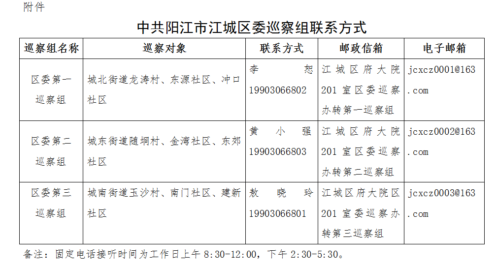 巡察期间,区委巡察机构设有专门联系方式(详见附件),欢迎广大党员、干部、群众向巡察组反映有关情况和问题。