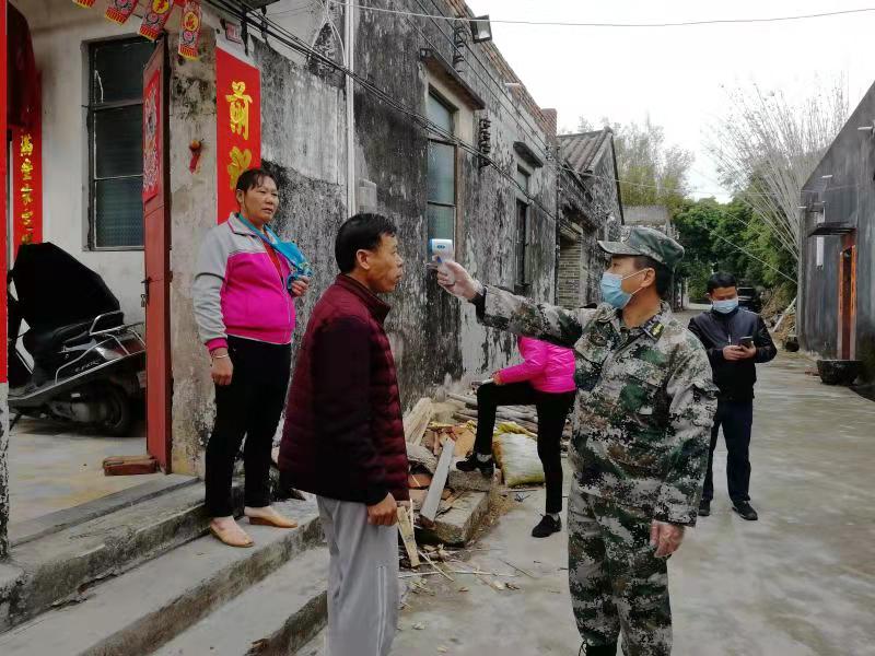 雅韶镇纪委干部参与并监督工作人员做好外来渔围务工人员登记筛查和体温监测工作。