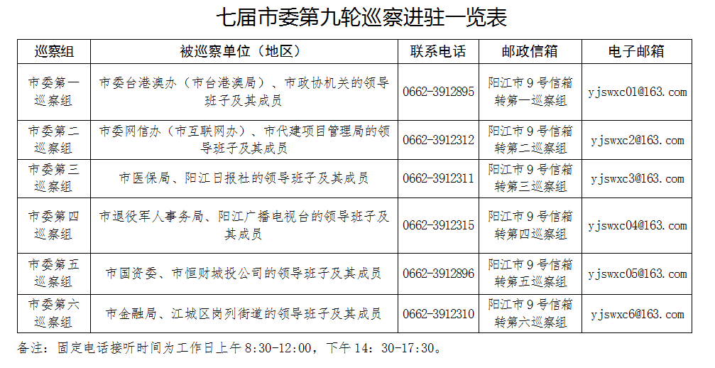 截至11月6日,七届市委第九轮巡察6个巡察组完成对市委网信办(市互联网办)、市委台港澳办(市台港澳局)、市退役军人事务局、市国资委、市医保局、市金融局、市政协机关、阳江日报社、阳江广播电视台、市代建项目管理局、市恒财城投公司、江城区岗列街道等12个部门(单位、地区)的进驻。至此,七届市委第九轮巡察全面展开。