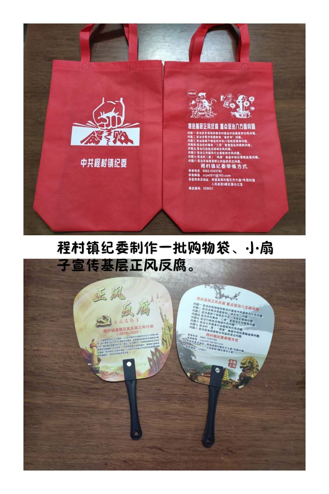 程村镇向群众发放基层正风反腐宣传购物袋和小扇子
