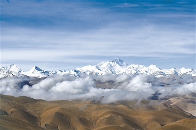 近年来,珠峰生态环境持续向好。中国2020珠峰高程测量数据可用于地球动力学板块运动等领域研究;精确的峰顶雪深、气象和风速等数据,将为冰川监测、生态环境保护等方面研究提供第一手资料。图为从加吾拉山口眺望珠穆朗玛峰,这里可以看见喜马拉雅山脉5座8000米以上的山峰。(图片来源:视觉中国)
