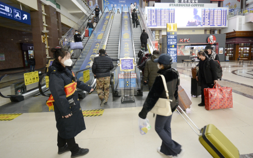 图为北京站工作人员在候车大厅进行防疫提示。 新华社记者 李欣 摄