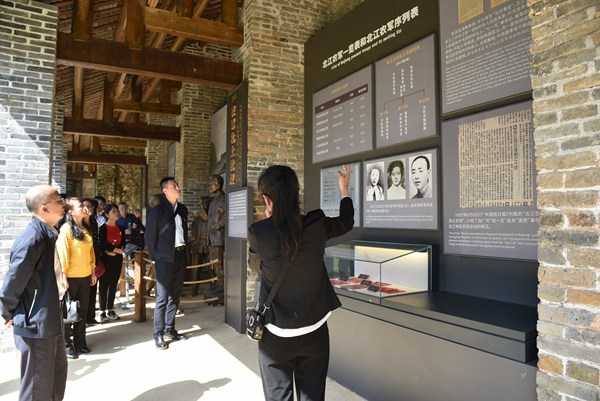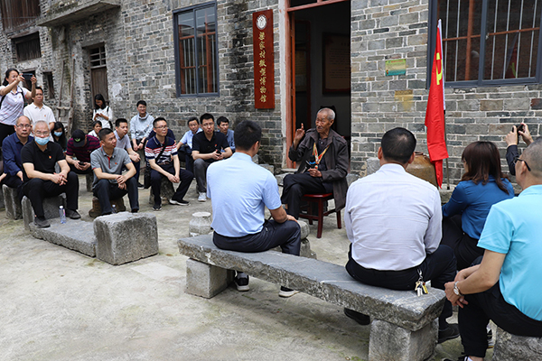 韶关市仁化县纪委监委党员干部在石塘镇双峰寨认真听讲解员介绍“北江地区农民运动情况”。