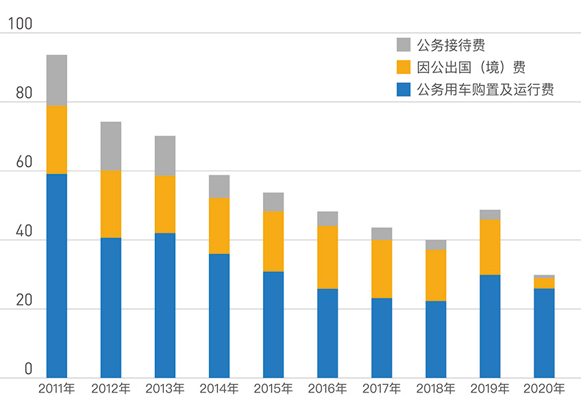 “三公”经费包括因公出国(境)费、公务用车购置及运行费和公务接待费,一直以来很受社会关注。自2011年起,中央政府每年都向社会公开“三公”经费决算。2011年,中央本级“三公”经费决算为93亿元,到2020年,已不足2011年的三分之一。