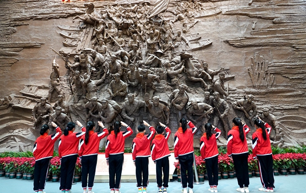 广西壮族自治区全州县邓吉小学组织少先队员参观湘江战役纪念馆。戴着红领巾的孩子们聆听“三年不饮湘江水,十年不食湘江鱼”的长征故事后,满怀敬意地向烈士雕塑行队礼。(广西壮族自治区桂林市全州县纪委监委 文庭庭 摄)