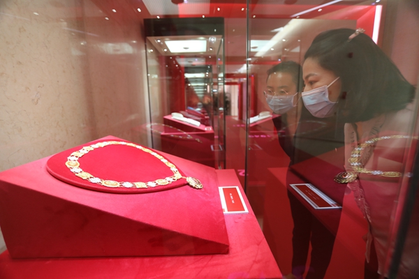 “红色记忆——天津革命文物展”正在天津博物馆展出,吸引众多市民前来打卡。图为两位年轻观众驻足细看张伯礼院士“人民英雄”荣誉称号奖章,体悟伟大抗疫精神。(天津市纪委监委驻市文化和旅游局纪检监察组供 靳挺 摄)