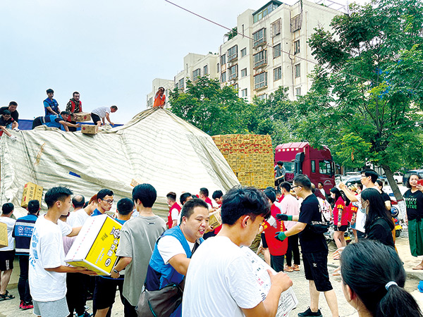 7月21日起,郑州慈善总会本部志愿者有序参与物资摆放、分发。据不完全统计,参与志愿者达500人次,装卸物资数百吨。 牛思颖 摄