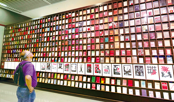 在北京“真理的力量——纪念马克思诞辰200周年主题展览”现场,一位外国观众被马克思原版图书墙吸引。 (图片来源:视觉中国)