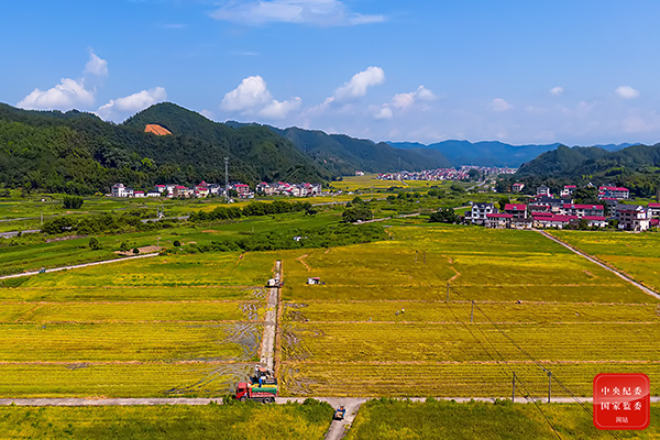处暑满地黄,家家修廪仓。江南地区的水稻已经成熟,趁着天气晴好,农民驾驶收割机在金灿灿的稻田里来回穿梭,抢收早稻。(杭州市纪委监委供 万玲娟 摄)