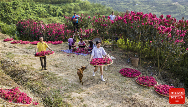 8月正值紫薇花季,重庆市南川区水江镇宏图村天鹅绒红叶紫薇基地里,村民们趁着晴好天气,正忙着采摘、分拣、晾晒药用紫薇花。(重庆市南川区纪委监委供 彭应忠 摄)