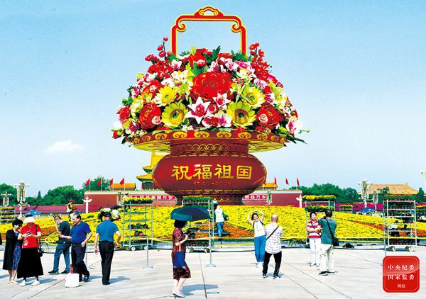 9月23日凌晨,天安门广场中心“祝福祖国”花篮容颜初现。一夜之间,顶高18米的花篮完成吊装。篮体南侧书写“祝福祖国,1949-2021”字样,篮体北侧书写着“欢度国庆,1949-2021”字样。花篮就位,洋溢着热烈、喜庆、欢乐的节日氛围,寄托了人们对祖国的美好祝福。