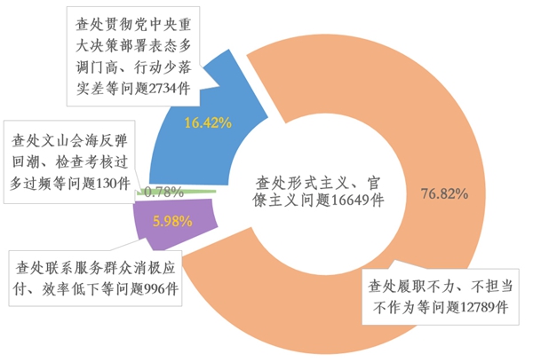 党的十九大以来,新疆维吾尔自治区查处违反中央八项规定精神问题24369件,处理党员干部26247人。其中,查处形式主义、官僚主义问题16649件,处理党员干部17811人,查处问题数和处理人数分别占查处总数的68.32%、67.86%。从查处问题类型看,查处履职不力、不担当不作为等问题占比仍然较大,需要持续发力;文山会海反弹回潮、检查考核过多过频等问题得到有效遏制,查处比例相对较小,持续纠治效果明显。