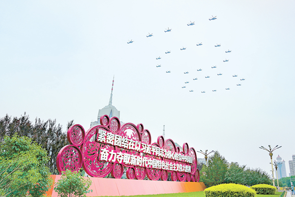 图为2021年7月1日,庆祝中国共产党成立100周年大会在北京天安门广场隆重举行,飞行编队飞过北京上空。(图片来源:人民视觉)