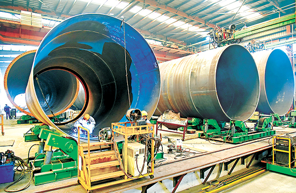 11月23日,江苏连云港,重山风力设备有限公司生产车间,工人正在加紧生产一批来自一带一路国家订单的风力发电塔筒设备。 (图片来源:视觉中国)