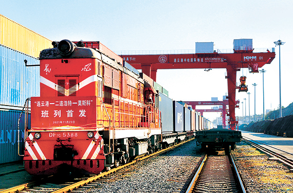 11月23日,装载货物的“中国(连云港)至俄罗斯(莫斯科)”中欧班列从中哈(连云港)物流合作基地鸣笛启程,奔赴俄罗斯首都莫斯科,标志着连云港至莫斯科中欧班列首发。 (图片来源:人民视觉)