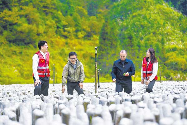 图为广西壮族自治区柳州市纪委监委驻融水县怀宝镇东水村乡村振兴工作队队员罗毅(左一)、梅梅(右一)和村干部在木耳基地查看木耳的长势。姚瑶 摄