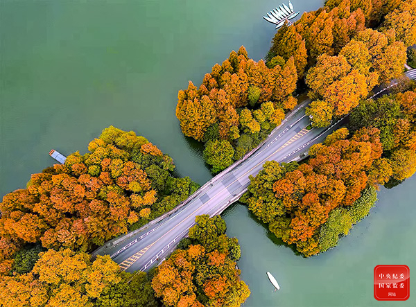 杭州西湖杨公堤,小船穿行绿色湖面,两岸的梧桐、红枫、水杉等林木迎冬“换色”、层层叠叠,航拍之下色彩斑斓,分外美丽。(杭州市纪委监委供 项军 摄)
