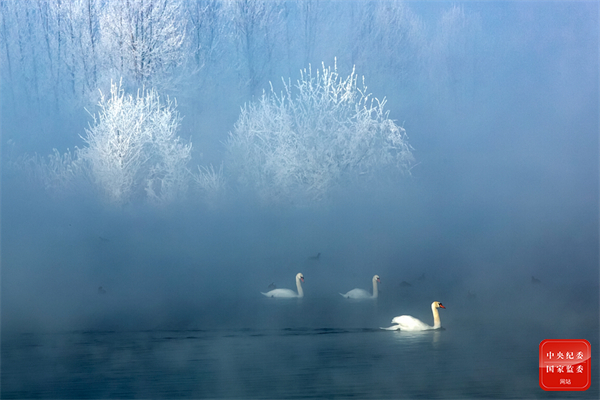 冬日清晨,朝阳初升,新疆博尔塔拉河谷湿地公园凝结了一层厚厚的雾凇,洁白的天鹅惬意悠闲地在静谧的泉水里嬉戏畅游,构成了冬日美景。(新疆维吾尔自治区温泉县纪委监委供 蒋直言 摄)