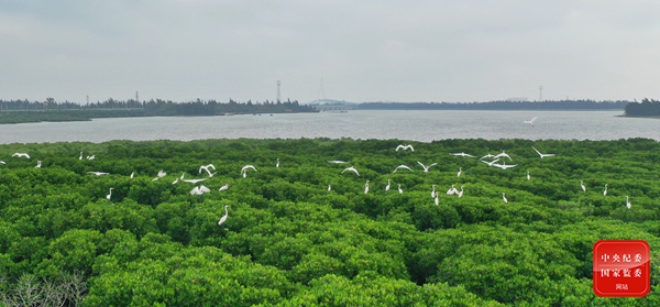 海南省海口市美兰区红树林资源丰富,每年11月到次年3月,大批候鸟在红树林及周边水系越冬、停歇,良好的生态环境为它们提供了栖息地。图为白鹭在演丰镇红树林中翱翔、觅食。(海南省海口市美兰区纪委监委供 王聘钊 摄)