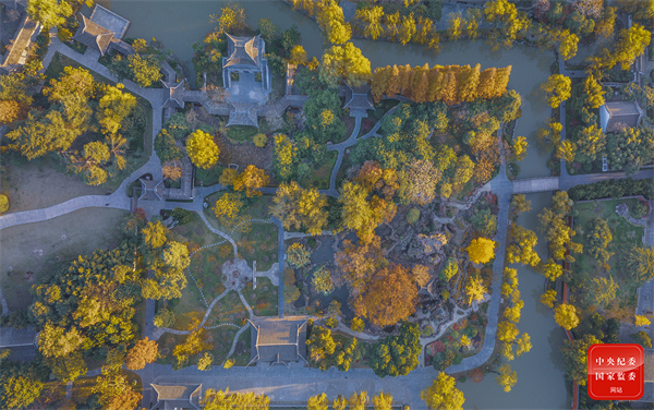 江苏省淮安市百年园林清晏园内,五彩斑斓,景色迷人,与园林古建相映成趣,构成一幅和谐画面。(江苏省淮安市淮阴区纪委监委供 陈光晰 摄)