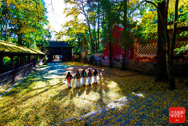 贵州省黄平县飞云崖景区内满地金黄,树影婆娑,光影斑驳。游客们随着迎风飘落的银杏叶翩翩起舞,享受着如诗如画的美景。(贵州省黄平县纪委监委供 潘锋 摄)