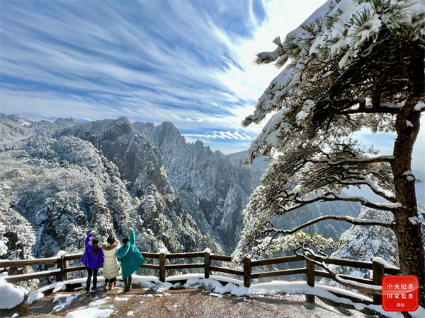 黄山迎来今年冬季的初雪,山峦树木披上银装,宛如童话般世界,游客们纷纷打卡留念,用相机定格住这美好画面。(安徽省黄山市屯溪区纪委监委供 程剑 摄)