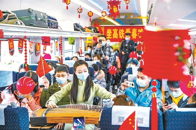 春节临近,铁路部门组织青年职工在做好疫情防控的前提下,为旅客带来自编自演的“高铁春晚”。图为1月28日,在重庆西北环线C451次列车上,青年职工为旅客弹奏古筝。 新华社记者 黄伟 摄