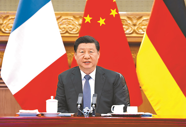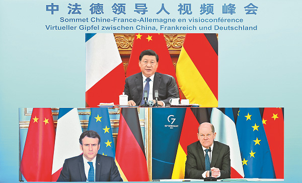 国家主席习近平3月8日下午在北京同法国总统马克龙、德国总理朔尔茨举行视频峰会。