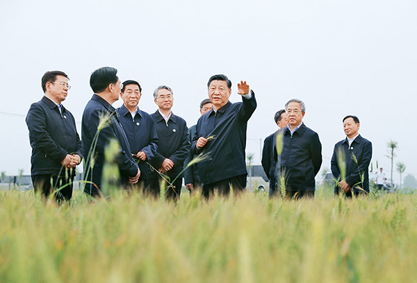 2021年9月13日至14日,中共中央总书记、国家主席、中央军委主席习近平在陕西省榆林市考察。这是13日下午,习近平在米脂县银州街道高西沟村临时下车,察看粮食作物长势,同正在田间劳作的老乡拉家常。 新华社记者 李学仁/摄