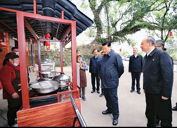 2021年3月22日至25日,中共中央总书记、国家主席、中央军委主席习近平在福建考察。这是23日下午,习近平在三明沙县夏茂镇俞邦村考察时,在小吃摊边同乡亲们亲切交谈。 新华社记者 王晔/摄