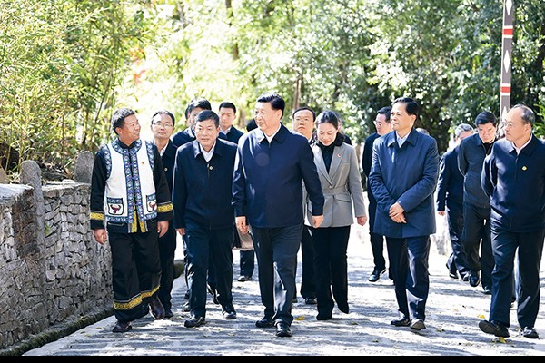 2020年1月19日至21日,中共中央总书记、国家主席、中央军委主席习近平来到云南,看望慰问各族干部群众,向全国人民致以新春祝福。这是19日下午,习近平在腾冲市清水乡三家村中寨司莫拉佤族村了解乡村振兴和建设少数民族特色村寨情况。 新华社记者 谢环驰/摄