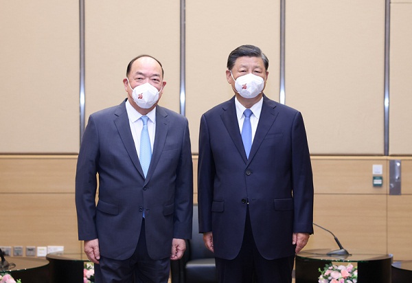 6月30日下午,国家主席习近平在香港会见前来出席庆祝香港回归祖国25周年活动的澳门特别行政区行政长官贺一诚。新华社记者 刘彬 摄