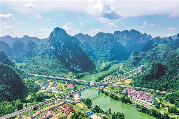 党的十八大以来,党和国家各项事业取得历史性成就、发生历史性变革,最根本的原因在于有习近平总书记作为党中央的核心、全党的核心掌舵领航,在于有习近平新时代中国特色社会主义思想科学指引。图为8月16日,位于广西河池市的贵南高铁龙江双线特大桥开始铺轨,标志着作为我国“八纵八横”高速铁路主通道的贵南高铁正式进入铺轨阶段。新华社记者 曹祎铭 摄