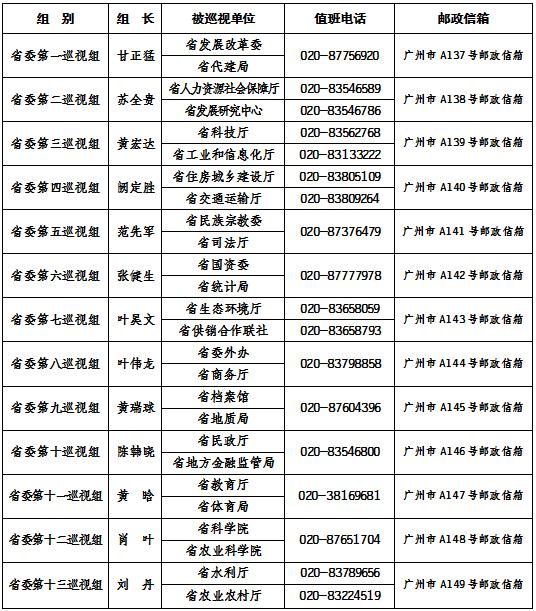 十三届广东省委第一轮巡视进驻一览表