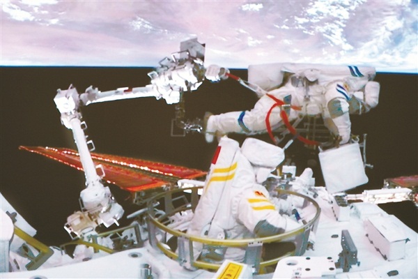 9月1日18时26分,我国航天员首次从问天实验舱气闸舱出舱实施舱外活动。新华社发(李杰 摄)
