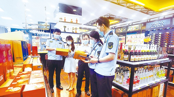 中秋节前夕,云南省楚雄彝族自治州纪委监委与州市场监督管理局联合组成督查组,深入超市、酒店等场所开展监督检查,严查隐形变异“四风”问题。图为督查组成员在某超市查看月饼、高档酒水购买情况,排查问题线索。徐燕梅 摄