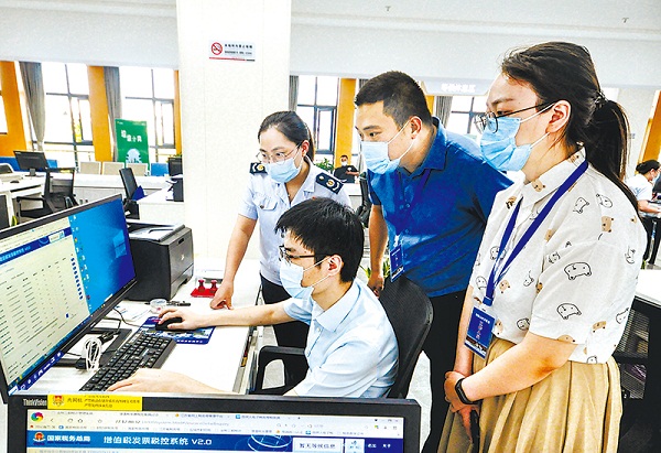 9月7日,江苏省射阳县纪检监察干部利用税票管理系统核查违规收受节礼问题线索。 王万舜 摄