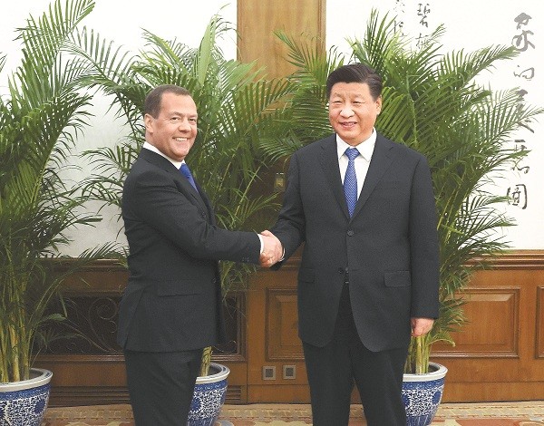 12月21日,中共中央总书记、国家主席习近平在北京钓鱼台国宾馆会见应中国共产党邀请访华的俄罗斯统一俄罗斯党主席梅德韦杰夫。新华社记者 殷博古 摄