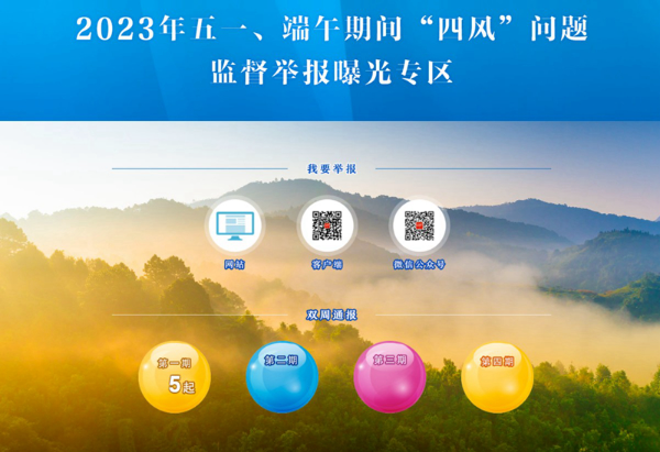 为持续强化正风肃纪,中央纪委国家监委网站推出“2023年五一、端午期间‘四风’问题监督举报曝光专区”,加大典型案例通报曝光力度,不断释放一抓到底、一刻不松的强烈信号。专区开设“我要举报”窗口,链接中央纪委国家监委统一举报平台,欢迎广大网友通过网站、手机客户端和微信公众号,对节日期间易发多发的违规公款吃喝、在隐蔽场所接受宴请、“舌尖上的浪费”、以电子红包和快递物流方式“隔空送礼”、公车私用、违规操办婚丧喜庆等问题进行举报。专区“双周通报”栏目从5月5日起,分4次集中对典型问题点名道姓通报曝光,强化警示震慑。