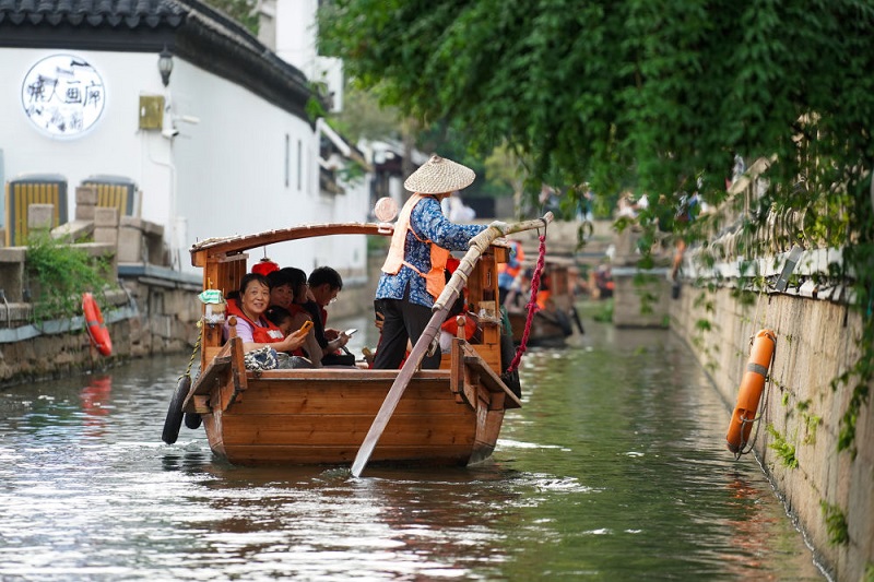 游客乘船在苏州平江历史文化街区休闲游玩(2023年7月3日摄)。新华社记者 李博 摄