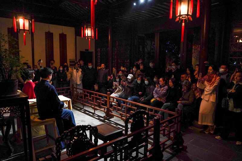 观众在苏州网师园内观看评弹表演(2023年4月5日摄)。新华社记者 李博 摄