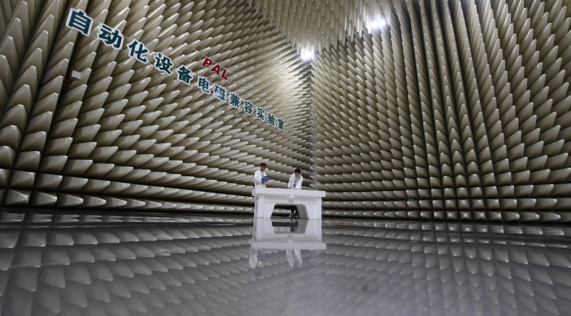 在南瑞集团有限公司自动化设备电磁兼容实验室,科研人员在进行辐射发射实验准备工作(2023年7月7日摄)。新华社记者 季春鹏 摄