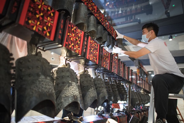 湖北省博物馆工作人员对曾侯乙编钟进行调试安装(2021年10月15日摄)。新华社记者 肖艺九 摄