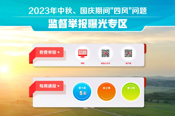 中秋、国庆节假将至,落实中央八项规定精神必须坚守节点、寸步不让。为持续强化正风肃纪,中央纪委国家监委网站推出“2023年中秋、国庆期间‘四风’问题监督举报曝光专区”,加大典型案例通报曝光力度,不断释放一抓到底、一刻不松的强烈信号。专区开设“我要举报”窗口,链接中央纪委国家监委统一举报平台,欢迎广大网友通过网站、手机客户端和微信公众号,对公款吃喝、在隐蔽场所违规接受宴请、违规收送礼品礼金、借操办婚丧喜庆之机敛财、公款旅游、公车私用等节日多发问题进行举报。专区“每周通报”栏目从9月22日起,分3次集中对典型问题点名道姓通报曝光,强化警示震慑。