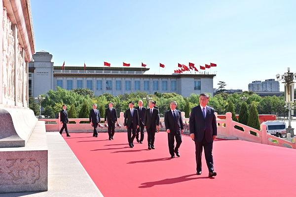 9月30日上午,党和国家领导人习近平、李强、赵乐际、王沪宁、蔡奇、丁薛祥、李希、韩正等来到北京天安门广场,出席烈士纪念日向人民英雄敬献花篮仪式。这是习近平等党和国家领导人瞻仰人民英雄纪念碑。新华社记者 岳月伟 摄