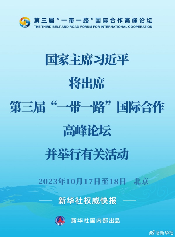 外交部发言人华春莹10月11日宣布:第三届“一带一路”国际合作高峰论坛将于10月17日至18日在北京举行,主题为“高质量共建‘一带一路’,携手实现共同发展繁荣”。国家主席习近平将出席高峰论坛开幕式发表主旨演讲,并为来华出席高峰论坛的嘉宾举行欢迎宴会和双边活动。