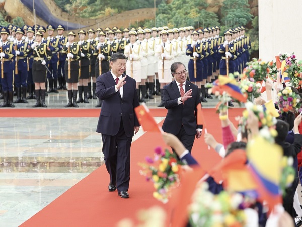 10月25日下午,国家主席习近平在北京人民大会堂同来华进行国事访问的哥伦比亚总统佩特罗举行会谈。这是会谈前,习近平在人民大会堂北大厅为佩特罗举行欢迎仪式。新华社记者 黄敬文 摄