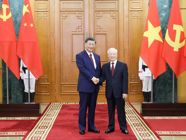 当地时间12月12日下午,刚刚抵达河内的中共中央总书记、国家主席习近平在越共中央驻地同越共中央总书记阮富仲举行会谈。双方宣布中越两党两国关系新定位,在深化中越全面战略合作伙伴关系基础上,携手构建具有战略意义的中越命运共同体。
