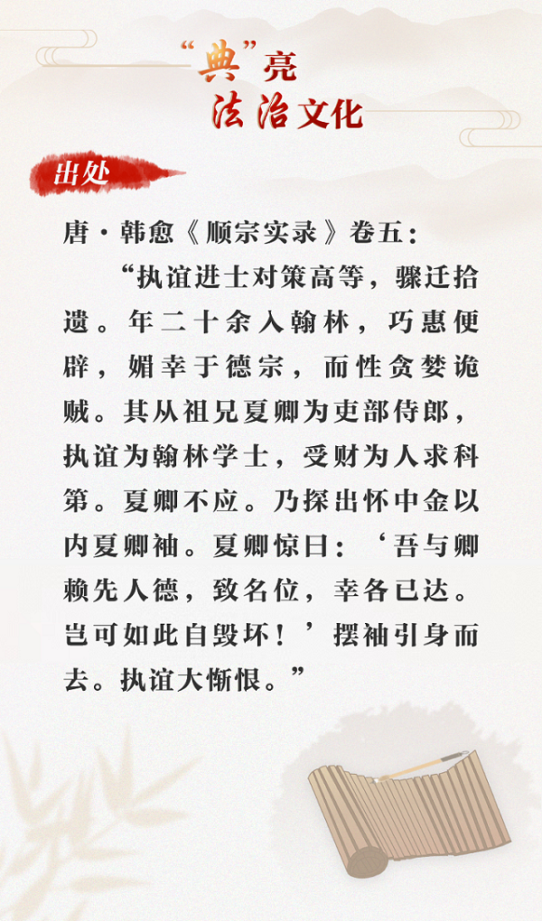 在中国历史上,唐代繁荣昌盛,其法律体系是中华法系的代表,倡导“德礼为政教之本,刑罚为政教之用”,强调德礼在治国理政中的作用。唐代立法制度空前成熟,但实施过程中离不开秉持德礼、廉洁公正的官员。作为唐代大儒,韩愈笔下“摆袖缺金”的故事,是唐朝德治廉政思想的一个缩影。夏卿的正德洁身与执谊的巧惠贪婪截然相反,他不忘初心的感怀和摆袖引身的举动,正寄寓着贤士对于清廉政治的理想,深为韩愈所称赞。“摆袖却金”这一典故成语以及后来衍化出的“两袖清风”一词,往往被用来形容不为私利、清廉公正的官员品格。