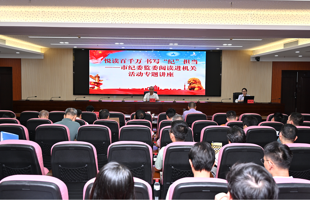 为推动党纪学习教育走深走实,营造“爱读书、善读书、读好书”的良好氛围,进一步提升纪检监察干部综合素质,7月25日下午,阳江市纪委监委举办“悦读百千万 书写‘纪’担当”阅读进机关专题辅导讲座,邀请阳江市委党校党建与统战教研室主任关天宇作专题辅导报告。市纪委监委各派驻(出)机构、机关各部门、市委巡察机构、审查调查保障中心全体干部职工参加了讲座。